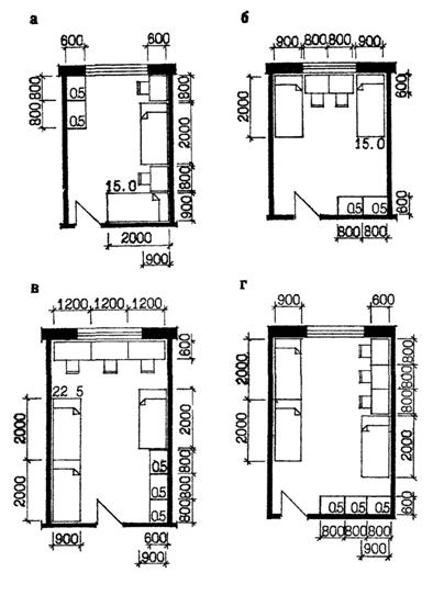 III - схемы планов кухонь с настольным оборудованием: в - с односторонней расстановкой; г - с двухсторонней расстановкой.
