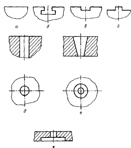 а - плоскость, б - Т-образный паз, в - П-образный паз, г - П-образный выступ, д - цилиндрическое отверстие, е - коническое отверстие, ж - цилиндрически выточка