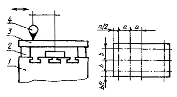 Стойку с измерительной головкой перемещают вдоль линейки и определяют правильность формы профиля поверхности в точках измерения, расположенных друг от друга на расстояниях а или b, равных приблизительно шагу расположения Т-образных или П-образных пазов.