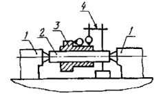 В центрах 1 (рисунок А.7) закрепляют коническую оправку 2 (конусность оправки от 1/1000 до 1/10000) с установленной на ней деталью 3. Стойку с измерительной головкой 4 устанавливают так, чтобы наконечник головки касался контролируемой поверхности детали. Оправку с деталью проворачивают.