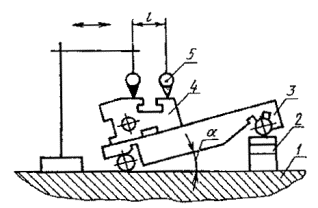Контролируемую деталь устанавливают на синусную линейку 3, настроенную на номинальный угол с помощью плоскопараллельных концевых мер длины 2 на поверочной плите 1.