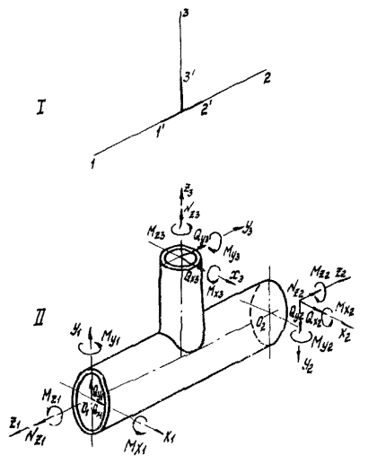 в сечениях трубопровода находят компоненты усилий и моментов как в пространственной стержневой системе под действием расчетных нагрузок и воздействий;