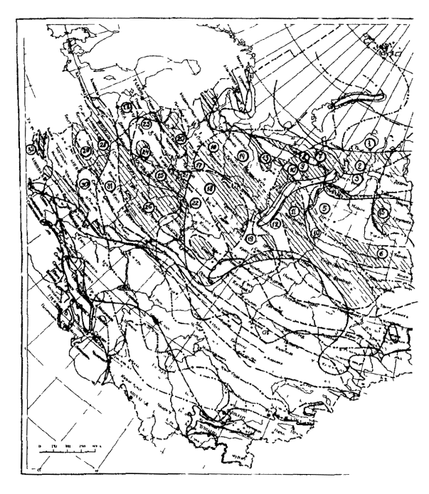 На рис. 20 приведена разбивка вышеуказанных территорий на зоны, которые определены как пересечение областей равных температур tVII, tI, ΔI, tтоп в соответствии с картами 5 - 7, СНиП II-6-74 и карты СССР с температурой почвы под естественным покровом на глубине 160 см для сентября по "Климатическому атласу СССР".