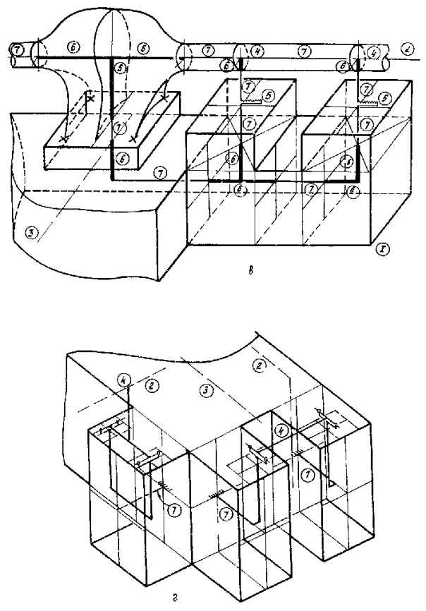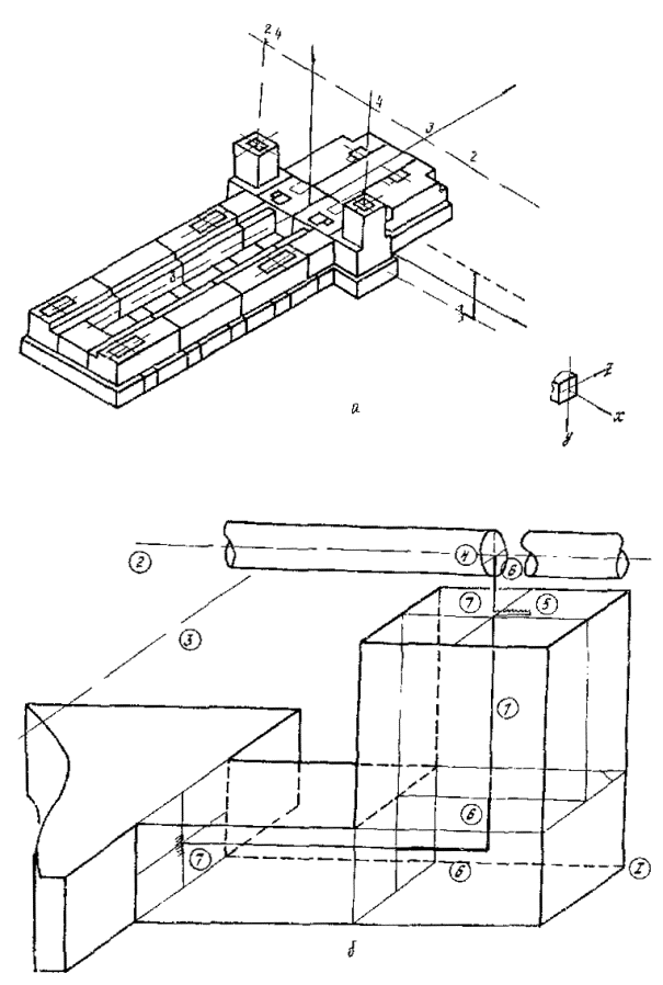 На рис. 21, а, б, в, г введены следующие обозначения: 1 - деталь фундамента под разгрузочную опору; 2 - ось трубопровода, являющаяся одновременно осью патрубка нагнетателя ГПА; 3 - продольная ось установки ГПА; 4 - точка пересечения осей разгрузочной опоры и трубопровода; 5 - узел разгрузочной опоры, отражающий взаимодействие трубопровода обвязки и фундамента под разгрузочную опору; 6 -абсолютно жесткая вставка; 7 - упругая вставка, характеристики F , I, W, Wp которой равны фактическим геометрическим характеристикам моделируемого сечения.