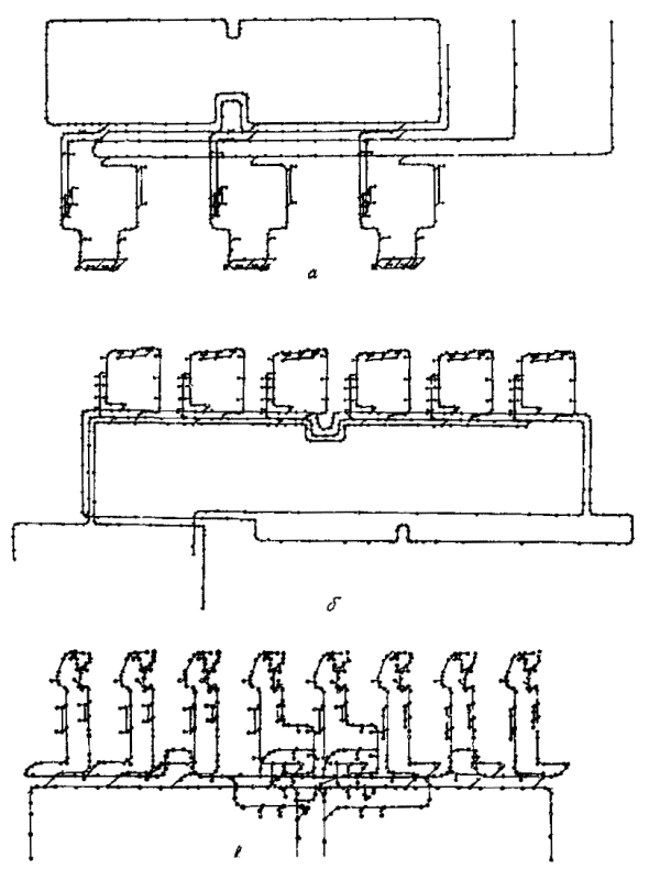 Расчетные схемы обвязочных трубопроводов для ГПА ГТН-25, Ц-16 и СТД-4000 представлены на рис. 22 а, б, в (сплошными точками обозначены расчетные узловые точки, сплошной линией - упругие элементы).