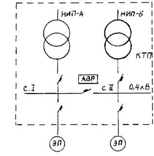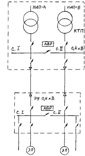 Для ЭП до 1 кВ эти требования, как правило, следует относить к секциям сборных шин цеховых ТП (рис. 3.2), при этом также допускается подключение взаиморезервируемых ЭП к сборным шинам вторичных РУ до 1 кВ, например, к распределительным пунктам (рис. 3.3). В обоснованных случаях, например, при прокладке протяженных кабелей между КТП и вторичным РУ до 1 кВ в неблагоприятных условиях (рис. 3.4) или при применении однотрансформаторных цеховых подстанций (рис. 3.5) требование к числу НИП и устройству АВР следует относить к секциям сборных шин вторичного РУ до 1 кВ.