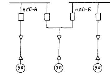 а) питание двух ЭП осуществляется радиальными линиями от двух секций сборных шин. Третий ЭП подключается через развилку из двух защитных аппаратов к обеим секциям сборных шин (рис. 3.6);