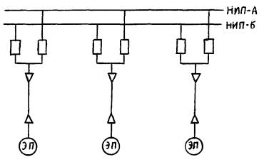 б) может быть выполнено также подключение каждого ЭП через развилку из двух защитных аппаратов к двум секциям сборных шин (рис. 3.7).