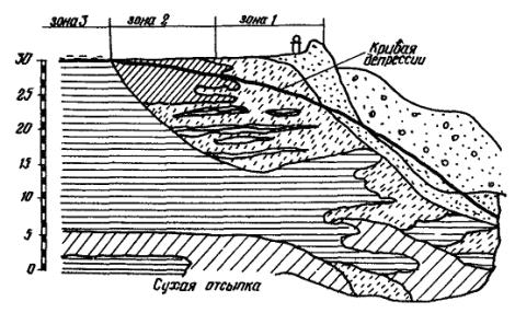 Промежуточная (переходная) зона - область между упорной призмой и центральной зоной. Размеры промежуточной зоны определяются пределами колебания уреза воды в отстойном прудке. В промежуточной зоне откладываются более мелкие фракции, чем в упорной призме.