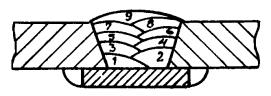 При сварке пластин следует соблюдать параметры режима и условия, установленные для проволоки проверяемой марки. Сварку необходимо выполнять при температуре окружающего воздуха не ниже 5 °С. Заполнение разделки соединения валиками следует выполнять по схеме, приведенной на рис. 2; допускается увеличение числа валиков, каждый последующий валик накладывают после очистки шлака с предыдущего валика при естественном охлаждении пластин на воздухе до температуры 250 °С.