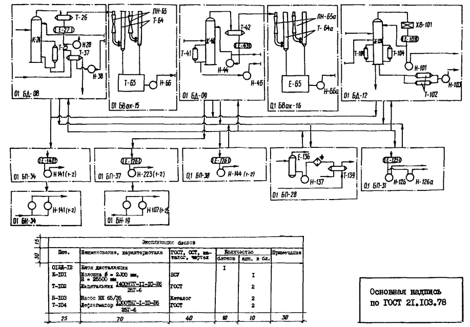 по оформлению: на технологическую схему наносят границы блоков; на чертеже расположения оборудования показывают контуры и маркировку блоков.