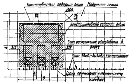 2.1. Компоновку осуществляют на опорной модульной сетке с ячейками размерами 1500´1500 мм. Размеры блока в плане должны быть кратными 1500, конфигурация блока - прямоугольной. По периметру блока должна быть оставлена зона, свободная от оборудования, шириной 375 мм.