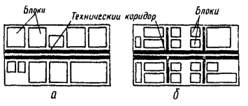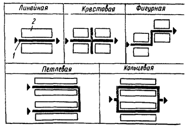 3.7. Трассировка технического коридора, а следовательно, и компоновка объекта в целом в зависимости от конкретных условий может быть линейной, крестовой, фигурной и пр. (рис. 6 и 7).