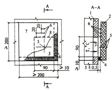 1 - огневая печь; 2 - образец; 3 - проем огневой печи; 4 - уплотнение из минеральной ваты; 5, 6 - термопары (термопары 6 следует располагать на границе ближайшего к огневой печи слоя, выполненного из горючего или трудногорючего материала); 7 - контрольная зона; 8 - граница контрольной зоны