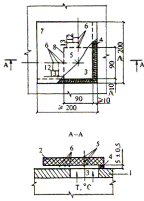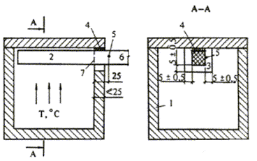 1 - огневая печь; 2 - образец; 3 - проем огневой печи; 4 - уплотнение из минеральной ваты; 5 - термопара; 6 - контрольная зона; 7 - граница контрольной зоны