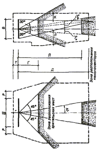 Места для зрителей в зрительных залах при кинодемонстрации рекомендуется проектировать в пределах зоны, изображенной на чертеже, где: