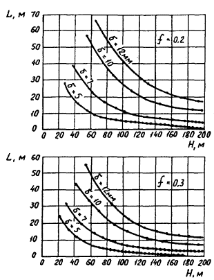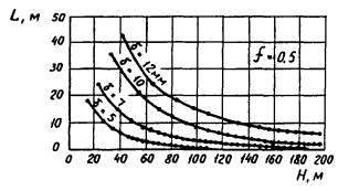Черт. 1. Зависимость расстояния между горизонтальными швами диафрагмы по высоте L от толщины диафрагмы d, величины коэффициента трения грунта по диафрагме f и высоты диафрагмы Н