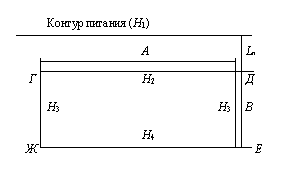 где h1 и hn – глубина безнапорного потока, отсчитываемая от относительного водоупора, соответственно на контуре питания и на контуре дренажа.
