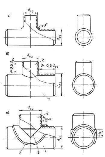 сварные, получаемые путем врезки одной трубы (или трубной обечайки) в другую под прямым углом (черт. 1, б), и тройники сварные, усиленные накладками (черт. 1, в), которые целесообразно применять при d ³ 300 мм. При этом для тройников с отношением диаметров ответвления к магистрали de2/de1< 0,2 накладки не ставятся, а при de2/de1< 0,5 накладка ставится только на магистрали. Ширина накладок (черт. 1, в) должна быть на магистральной части тройника bmai= 0,4de1, на ответвлении - blat= О.Зdez. Толщина накладок должна быть равна толщине стенки магистральной части тройника.