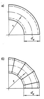 сварные, которые должны иметь не менее трех секторов и двух полусекторов (черт. 4, б). Отводы изготовляются с обязательной подваркой корня шва изнутри. Длина секторов по внутренней образующей должна быть не менее 0,15de.