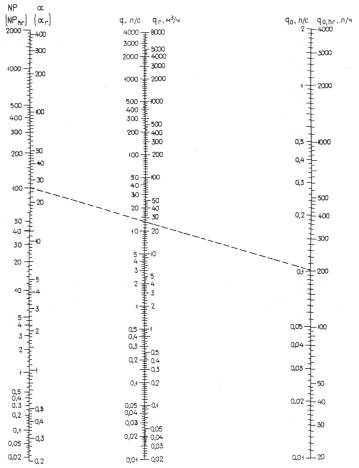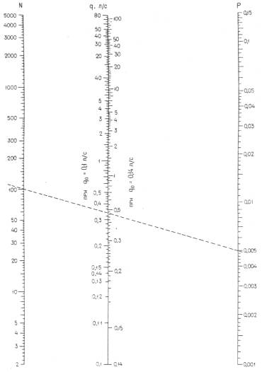 При известных расчетных величинах Р, N и значениях q0 = 0,1; 0,14; 0,2; 0,3 л/с для вычисления максимального секундного расхода воды допускается пользоваться номограммами 1-4 рекомендуемого приложения 4.