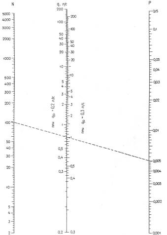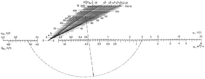 Черт. 3. Номограмма для определения секундных и часовых расходов воды q при q0 £ 0,3 л/с, N £ 200 и Р > 0,1