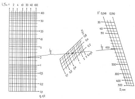 Черт. 2. Номограмма для определения секундных расходов воды q при q0 = 0,2 и 0,3 л/с и Р £ 0,15