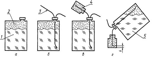 а - контейнер с пробой; б - контейнер с устройством для переноса пробы; в - жидкостная камера, помещенная над контейнером, с устройством для переноса пробы; г - положение системы при переносе пробы
