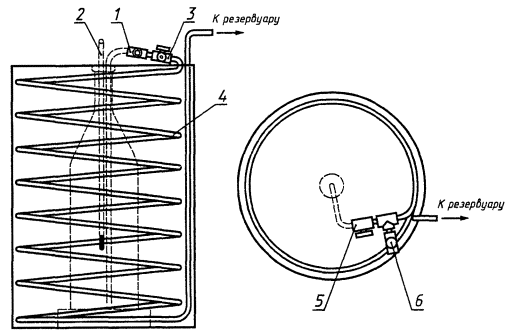 1 - выпускной клапан; 2 - термометр; 3 - вентиль продувки; 4 - медная трубка длиной 7,6 м, наружным диаметром 9,5 мм; 5 - выпускной клапан; 6 - вентиль продувки