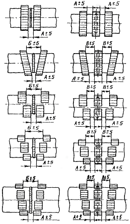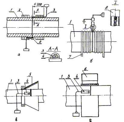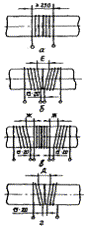 2.1.9. Количество преобразователей, необходимых для контроля температуры термической обработки, и схемы их установки следует определять в соответствии с табл. 2. Крепление горячего спая преобразователя на поверхности трубопровода рекомендуется производить одним из способов, указанных на черт. 1. При термической обработке сварных соединений изделий сложной конфигурации количество преобразователей для контроля температуры и схемы их установки следует определять из условия обеспечения контроля на всех участках сварного соединения (черт. 2), при этом необходимо учитывать размеры термообрабатываемых изделий в соответствии с табл. 2.