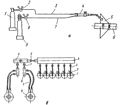 1.3. Питание одноплеменных универсальных ацетилено-кислородных горелок и кольцевых многопламенных горелок должно осуществляться от отдельных баллонов или групповых газобаллонных установок. Горючие газы не должны содержать сернистых соединений.
