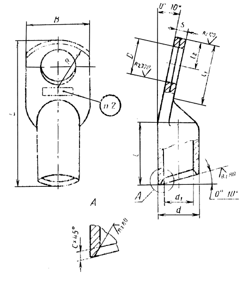 2. Конструкция, основные размеры, условное обозначение с указанием вида климатического исполнения по ГОСТ 15150, коды ОКП, предельные отклонения, расчетная масса наконечников и место нанесения маркировки должны соответствовать указанным на чертеже и в таблице.