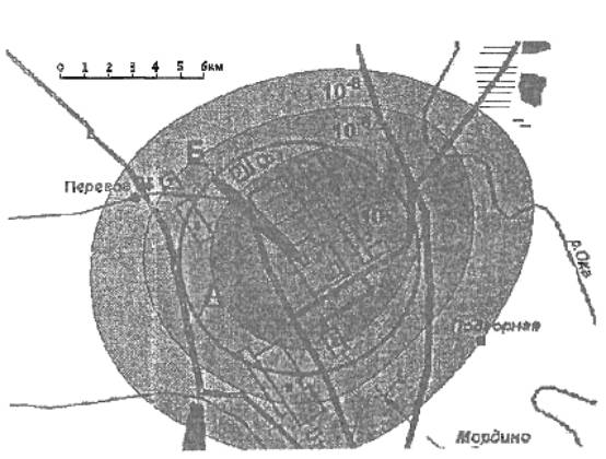 Рис. 3. Распределение потенциального риска по территории вблизи объекта, на котором возможны аварии с крупным выбросом токсических веществ: