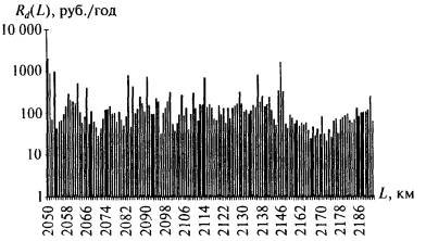 Рис. 4. Распределение ожидаемого ущерба Rd(L) по трассе магистрального