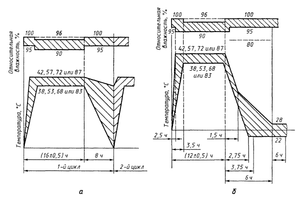 Температура является одним из основных ускоряющих факторов испытаний на влагостойкость. Для большинства применяемых материалов зависимости показателей долговечности от температуры, приведенные в ГОСТ 15150, раздел 6, сохраняют силу, так что использование испытательных температур 40 °С и 55 °С1) как для постоянных, так и для обоих указанных выше циклических режимов испытаний опробовано. При использовании режимов при температурах 70 °С и 85 °С выделяют два случая ограничений: в области влагопроницаемости некоторых полимерных материалов и в области некоторых коррозионных процессов.