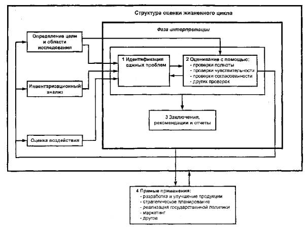 Интерпретация жизненного цикла - систематическая процедура идентификации, классификации, проверки и оценки информации, полученной по результатам ИАЖЦ и/или ОВЖЦ продукционной системы, и представления этих результатов для того, чтобы удовлетворить требования к применению, описанные при определении цели и области исследований. Исполнителю, предпринимающему исследование ОЖЦ, следует быть в близком контакте с заказчиком в ходе исследования, чтобы учесть все специфические вопросы. Эти связи должны поддерживаться и в ходе фазы интерпретации жизненного цикла. Поэтому важна прозрачность всей фазы интерпретации жизненного цикла. Предпочтения, допущения и выбор предпочтительных значений должны быть четко зафиксированы в заключительном отчете исполнителя ОЖЦ.