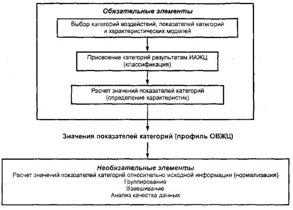 Для фазы ОВЖЦ выходом обязательных элементов является совокупность значений показателей для различных категорий воздействий.