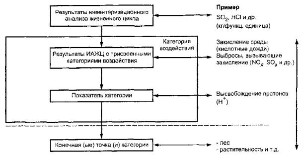 Концепция показателей категории (рисунок 2) основана на экологическом механизме взаимодействия. Для каждой категории воздействия имеется свой экологический механизм взаимодействия. Закисление среды (кислотные дожди), как категория воздействия, приведено на рисунке 2 в качестве примера.