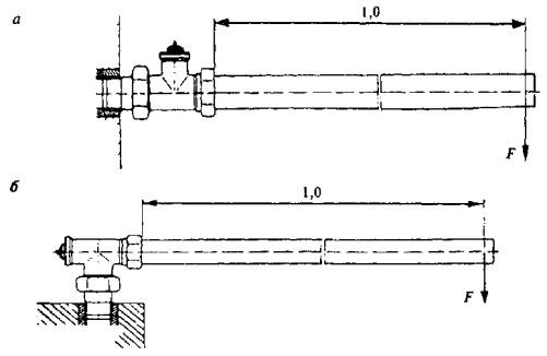 Испытание должно проводиться на стенде по рисунку 12. Необходимо затянуть соединительную гайку на трубе длиной 1,0 м в соответствии с данными таблицы 3. Прикладывают силу F к концу трубы и перпендикулярно ее оси в течение 30 с. Сила F равна изгибающему моменту в соответствии с таблицей 4.