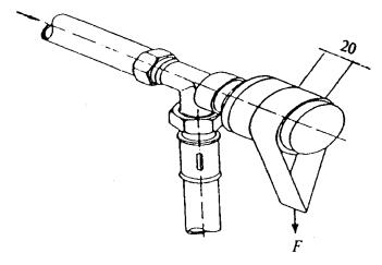 Испытание должно проводиться в соответствии со схемой, показанной на рисунке 14, при температуре воды (90 ± 2) °С и статическом давлении 0,1 МПа в трубопроводе. Через 20 мин будет достигнуто температурное равновесие. После этого прикладывают силу F = 250 Н и течение 30 с к регулятору температуры перпендикулярно его оси. Силу прикладывают на расстоянии 10 мм от наиболее удаленного конца при помощи ленты или ремня шириной 20 мм.