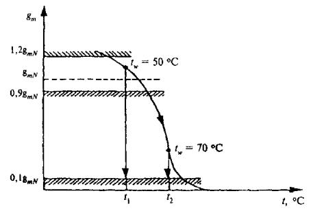 Начиная с температуры, на 6 °С ниже температуры закрытия, увеличивают температуру воздуха до тех пор, пока поток не достигнет величины gmx1 (рисунок 16). Эта величина должна находиться в пределах от 0,9 до 1,2 номинального потока. Необходимо дождаться установления равновесия.