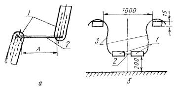 6.13. При проверке превышения температуры наружной поверхности рукоятки электрододержателя над температурой окружающего воздуха (п. 3.1.5) в зажимные устройства двух электрододержателей одного и того же типа, рассчитанных на один и тот же номинальный ток и расположенных один относительно другого под углом 180°, устанавливают согласно схеме, приведенной на черт. 2а, стержень из низкоуглеродистой конструкционной стали так, чтобы расстояние между зажимными устройствами обоих электрододержателей составляло А=(50±2) мм. Диаметр стержня должен быть равен наибольшему из указанных в таблице диаметров для электродов, закрепляемых в проверяемом электрододержателе. К электрододержателям должны быть подсоединены отрезки сварочного кабеля длиной не менее 2 м каждый с наибольшим сечением медных жил, указанным в таблице, для кабеля, присоединяемого к проверяемому электрододержателю. Соединенные с помощью стержня электрододержатели подвешивают в соответствии со схемой, приведенной на черт. 2б, между двумя деревянными планками толщиной 15 мм, установленными на расстоянии 1 м. Испытания проводят в закрытом помещении с минимальным воздушным потоком при температуре окружающего воздуха (20±5)°С. При испытании через электрододержатель пропускают сварочный ток, значение которого составляет 75 % указанного в таблице значения номинального сварочного тока, на который рассчитан проверяемый электрододержатель. Род тока - постоянный. Продолжительность испытания - 30 мин.