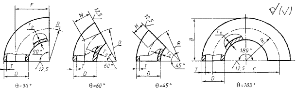 Примечания 1 Масса приведена для справок. 2 Масса отводов с θ = 60° и θ = 45° соответственно в 1,5 и 2 раза меньше, а отводов с θ = 180° в 2 раза больше указанной. |