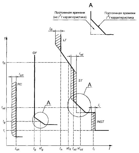 LT - длительное время; RC - дифференциальный ток; ST - короткое время; GF - замыкание на землю; INST - мгновенный