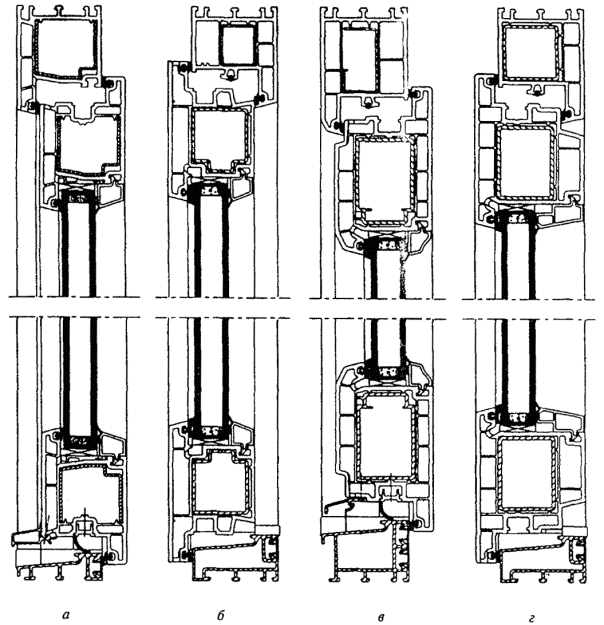 а - остекленное стеклопакетом; б - светлое, с заполнением верхней части полотна стеклопакетом и нижней - трехслойной панелью; в - остекленное многослойным стеклом; г - светлое, с заполнением верхней части полотна стеклопакетом и нижней - однослойной панелью (вспененный поливинилхлорид)