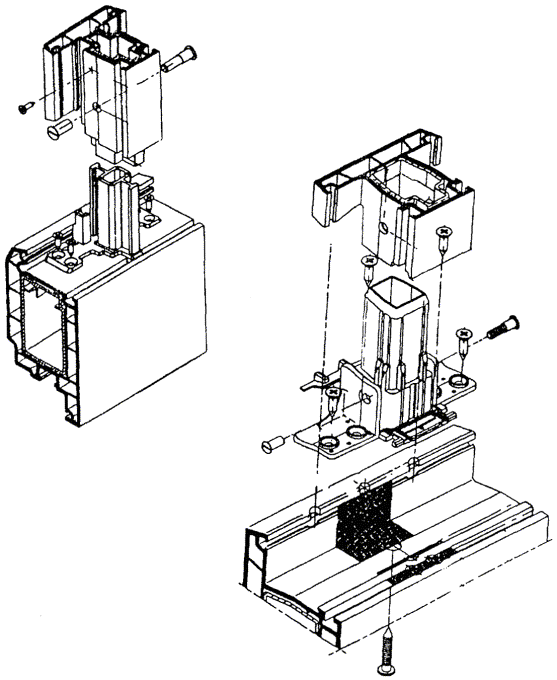 4.1.2 Полотна дверных блоков имеют рамочную конструкцию, сваренную из ПВХ профилей, усиленных стальными вкладышами. Угловые соединения рамки полотен дополнительно укрепляют угловыми усилителями. Вертикальные и верхние горизонтальные профили коробки имеют сварное соединение; нижний профиль коробки (порог) может быть изготовлен из металлических сплавов либо отсутствовать (при беспорожной конструкции дверного блока). Допускается изготовление замкнутых коробок, полностью сваренных из ПВХ профилей (включая нижний горизонтальный профиль). Импосты закрепляют в рамочных элементах при помощи механических соединений или сварки, а металлические пороги - при помощи механических соединений.