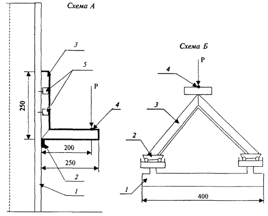 1 - опора; 2 - упор (для схемы Б - каретки); 3 - образец; 4 - точка приложения нагрузки; 5 - съемные хомуты крепления