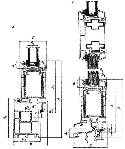 А, Б - высота, ширина комбинации профилей; A1, Б1 - высота, ширина профиля рамки полотна; А2, Б2 - высота, ширина профиля коробки; а1 - размер фальцлюфта (зазор в притворе); а2 - размер притвора под наплавом; а3 - высота фальца (четверти) для заполнения полотна; б1 - размер зазора под наплавом; б2 - толщина заполнения полотна