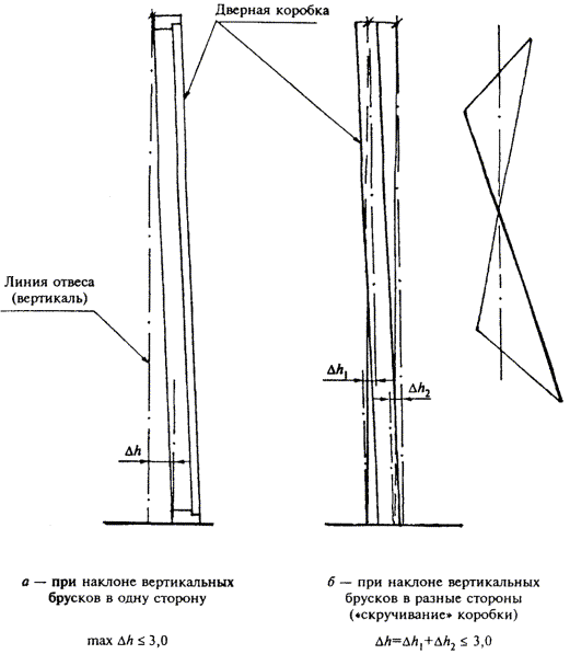 В.6 Дверные блоки следует устанавливать по уровню и отвесу. Отклонение от вертикали и горизонтали профилей коробок смонтированных изделий не должны превышать 1,5 мм на 1 м длины, но не более 3 мм на высоту изделия. При этом, если противоположные профили отклонены в разные стороны («скручивание» коробки), их суммарное отклонение от нормали не должно превышать 3 мм (рисунок В.2).