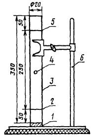 Стеклянная трубка длиной 350 мм и диаметром 20 мм с нанесенными на ней метками 2 и 5, расстояние между которыми 250 мм, вертикально укреплена в штативе 6.